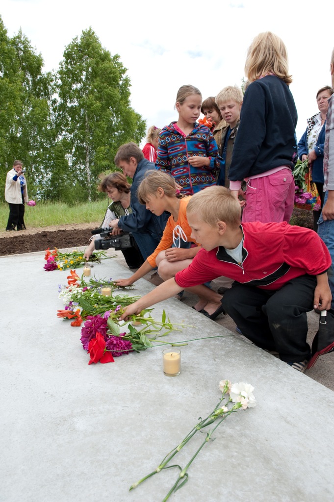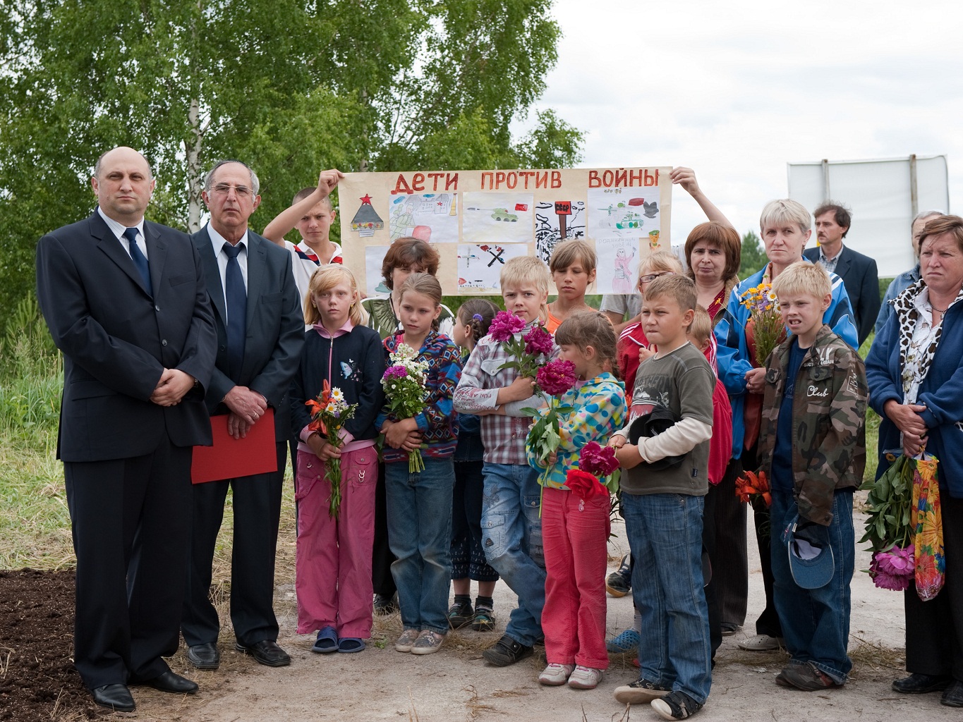 Очень важно, что на церемонии открытия Памятного Знака присутствовало много детей, которые держали красочный плакат с рисунками «Дети против войны». Дети должны знать и всегда помнить о судьбе своих дедов и прадедов. |